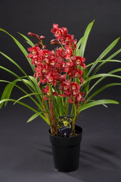 The pot Cymbidium is an elegant and remarkable plant. The Cymbidium has long, narrow green leaves and long flower spikes with 6 or more flowers per spike. The flowers have an elegant, mysterious appearance. King of Orchids plants feature at least 2 flower spikes. The Cymbidium is a soil orchid: the plant grows in the soil and only has underground roots, unlike many orchids which have aerial roots. The Cymbidium's colour spectrum runs from white, yellow, green, pink and red through to brown. The older a plant is, the more flower spikes it has.